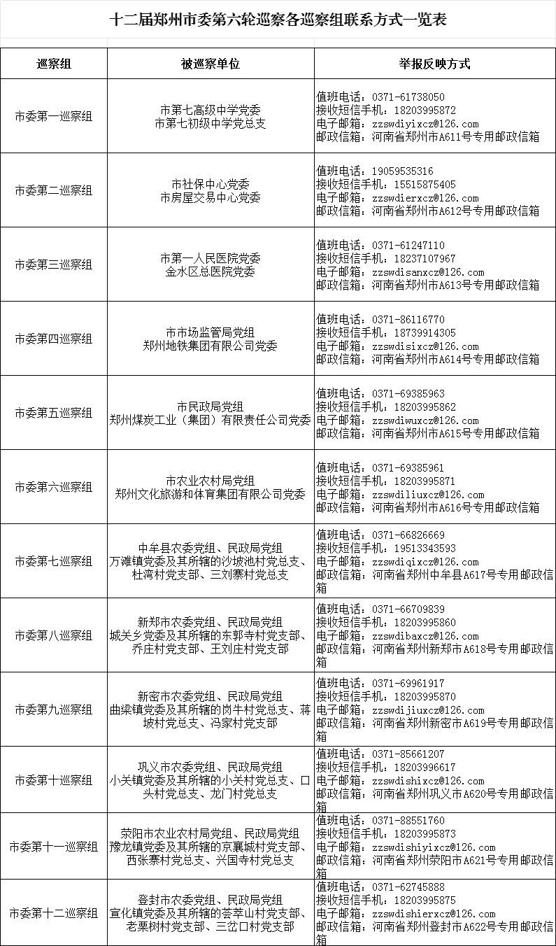 巡察期间,各巡察组均开通联系电话、接收短信手机、电子邮箱、邮政信箱,并在被巡察单位办公区等区域设立联系信箱,主要受理被巡察党组织领导班子及其成员,以及下一级党组织主要负责人和重要岗位领导干部违反党的政治纪律、组织纪律、廉洁纪律、群众纪律、工作纪律和生活纪律等方面的问题举报和反映。接收来电时间为工作日工作时间,受理截止日期为8月2日。对不属于巡察受理范围的事项,按规定转被巡察单位或有关部门办理。同时,巡察期间,还可以通过手机扫描“郑在巡”二维码向巡察组反映问题和线索。