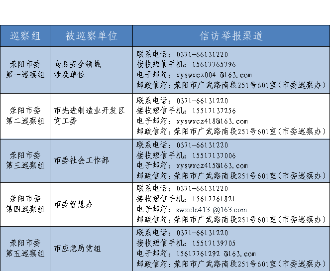 六届荥阳市委第十二轮巡察各巡察组联系方式一览表