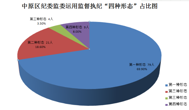 1-9月份,中原区运用“四种形态”共处理113人,其中运用第一种形态79人,占比69.9%,第二种形态党纪政务轻处分21人,占比18.6%,第三种形态党纪政务重处分4人,占比3.5%,第四种形态严重违纪涉嫌违法立案审查9人,占比8.0%,依法留置9人,解除留置并移送检察机关公诉9人。